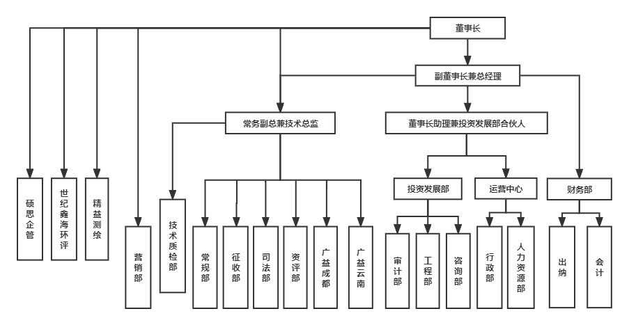 公司设有营销部、技术审查部、评估部(个贷组、常规业务组、非常规业务组)、数据部、运营中心(财务、系统、行政、人力资源、后勤支持)、环评公司、工程公司、咨询公司、税务师事务所等,内部组织机构完善。详见下图